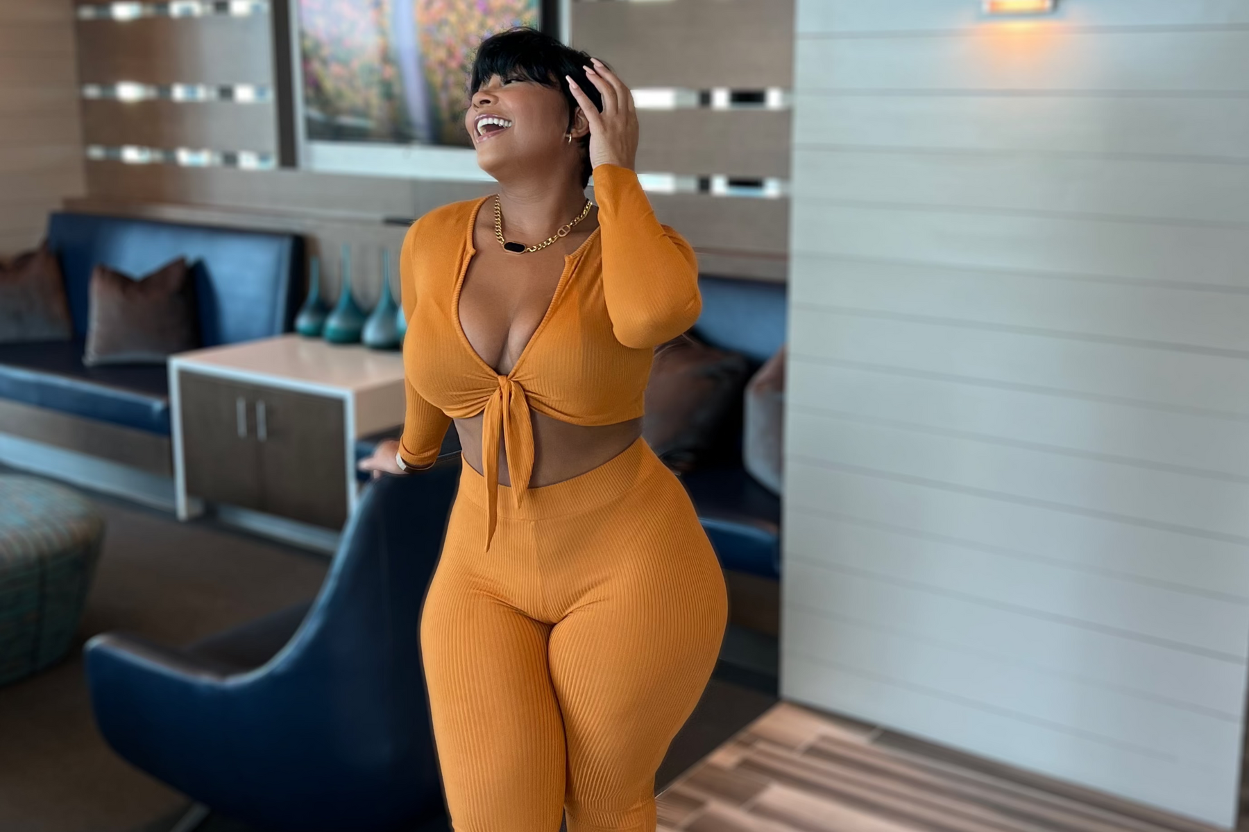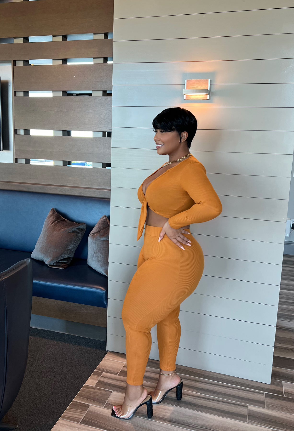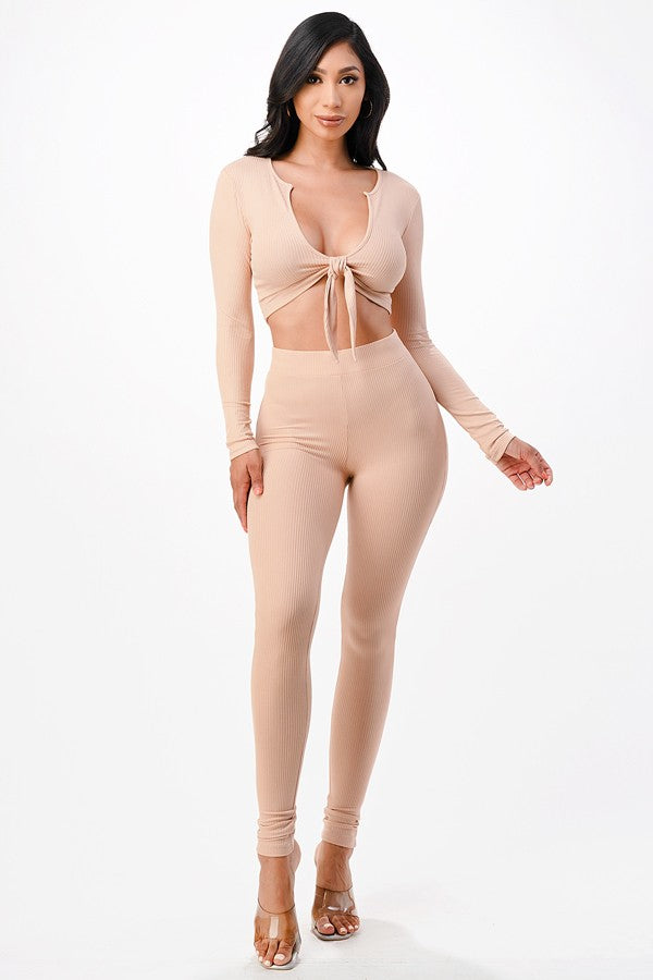 Rock a bold look with this vibrant two-piece set. The V-neck front tie long sleeve crop top and high waisted leggings make a statement–no matter the size or shade! Our model looks fab in Large and color rust.