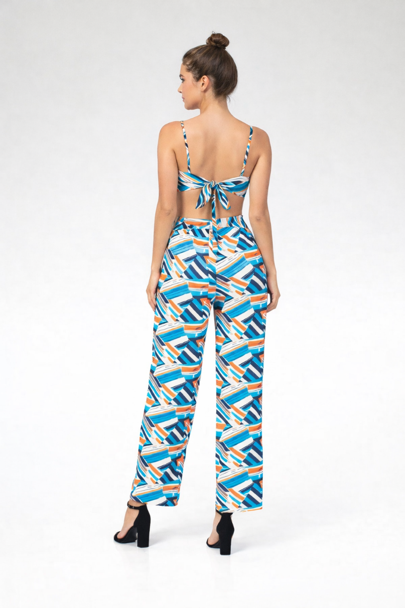 Transform your wardrobe with this vibrant front tie cropped top and pants set. Made from a comfortable stretch knit fabric, this sleeveless outfit features an eye-catching print and a waist band with a stylish strap belt. Crafted from a blend of 92% Polyester and 8% Spandex, this set is both comfortable and fashionable. Elevate your style with this must-have ensemble!